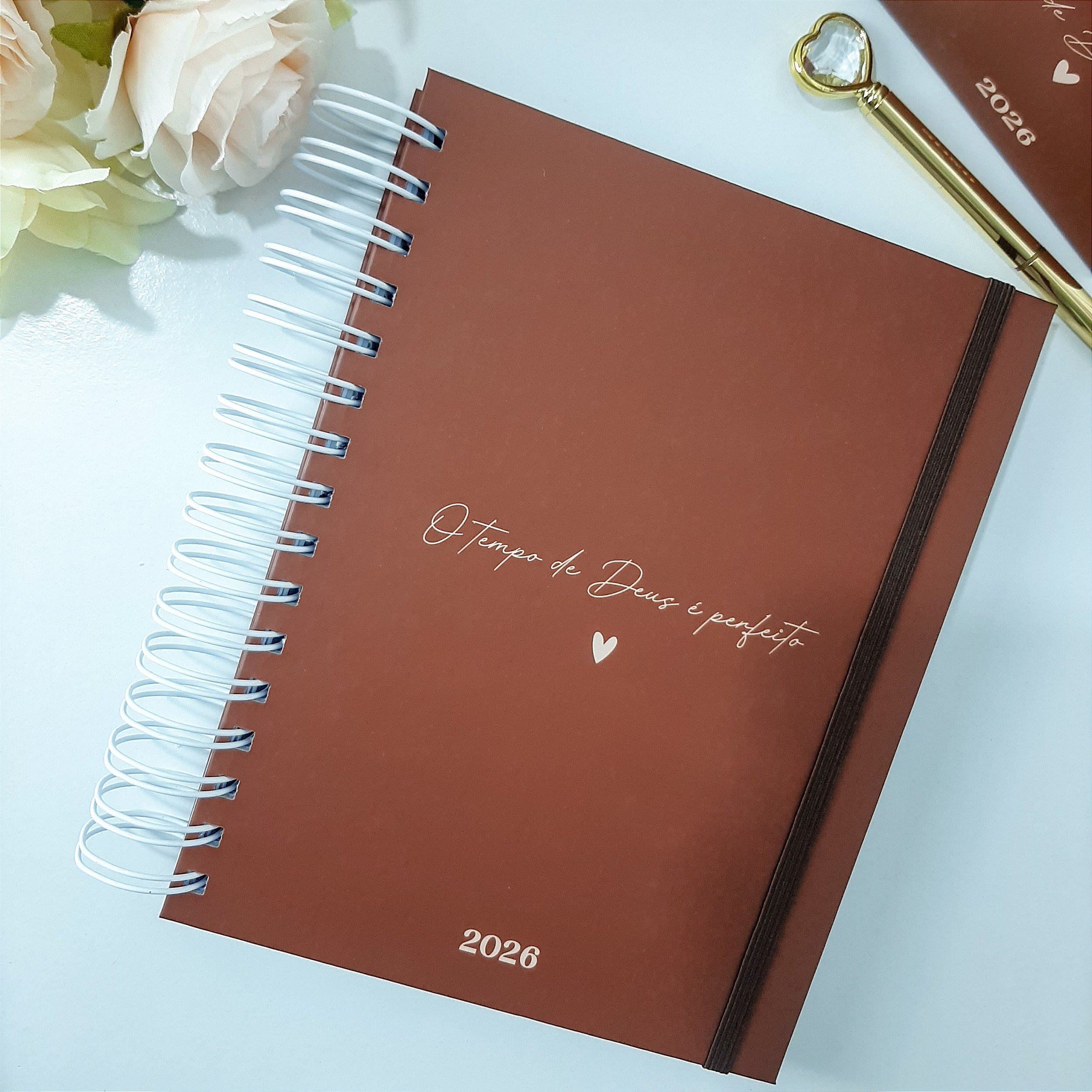 Nosso Planner 2026 possui capa dura personalizada, divisórias mensais com versículos, bolso plástico e 200 páginas (100 folhas 90g) no tamanho 16x21cm.