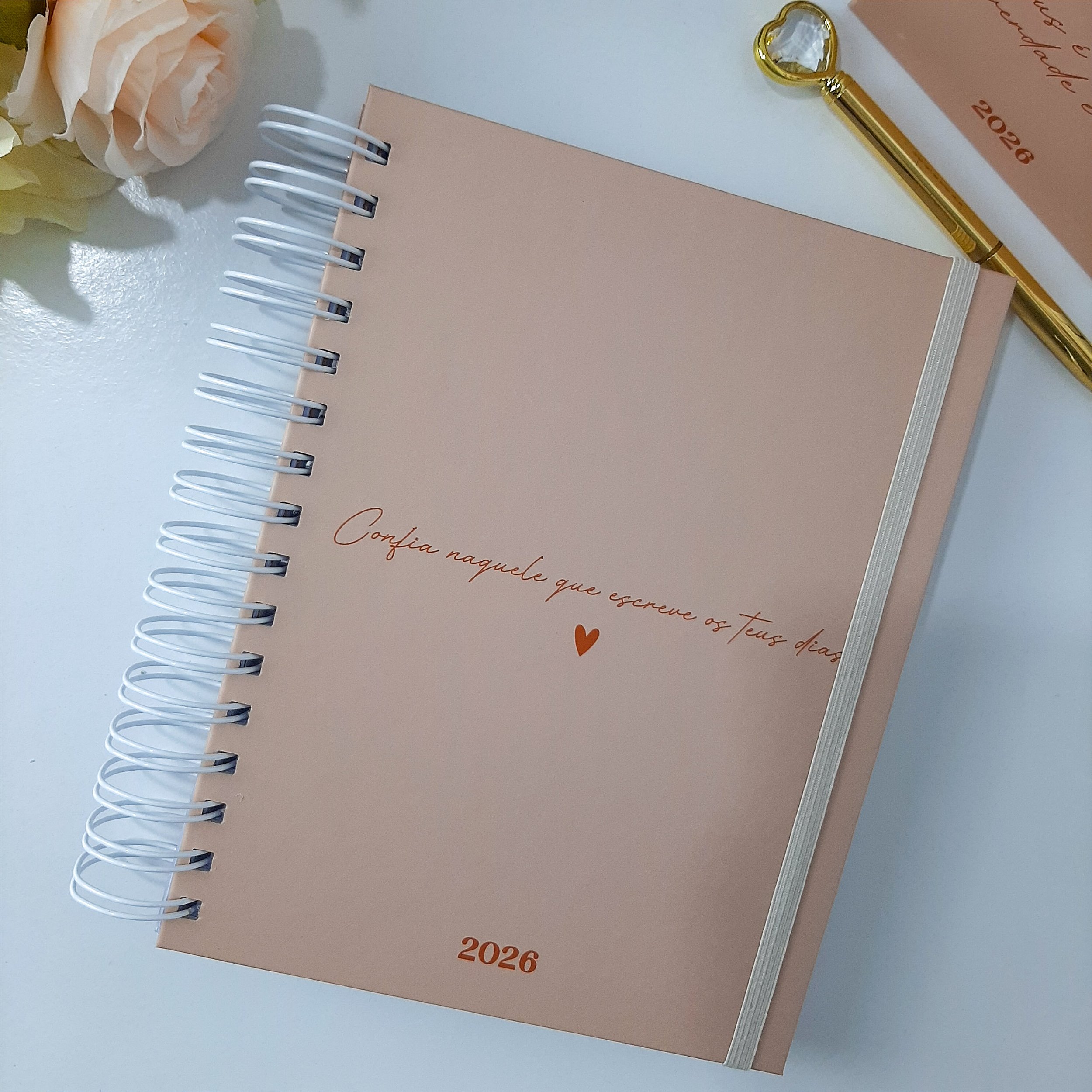 Nosso Planner 2026 possui capa dura personalizada, divisórias mensais com versículos, bolso plástico e 200 páginas (100 folhas 90g) no tamanho 16x21cm.